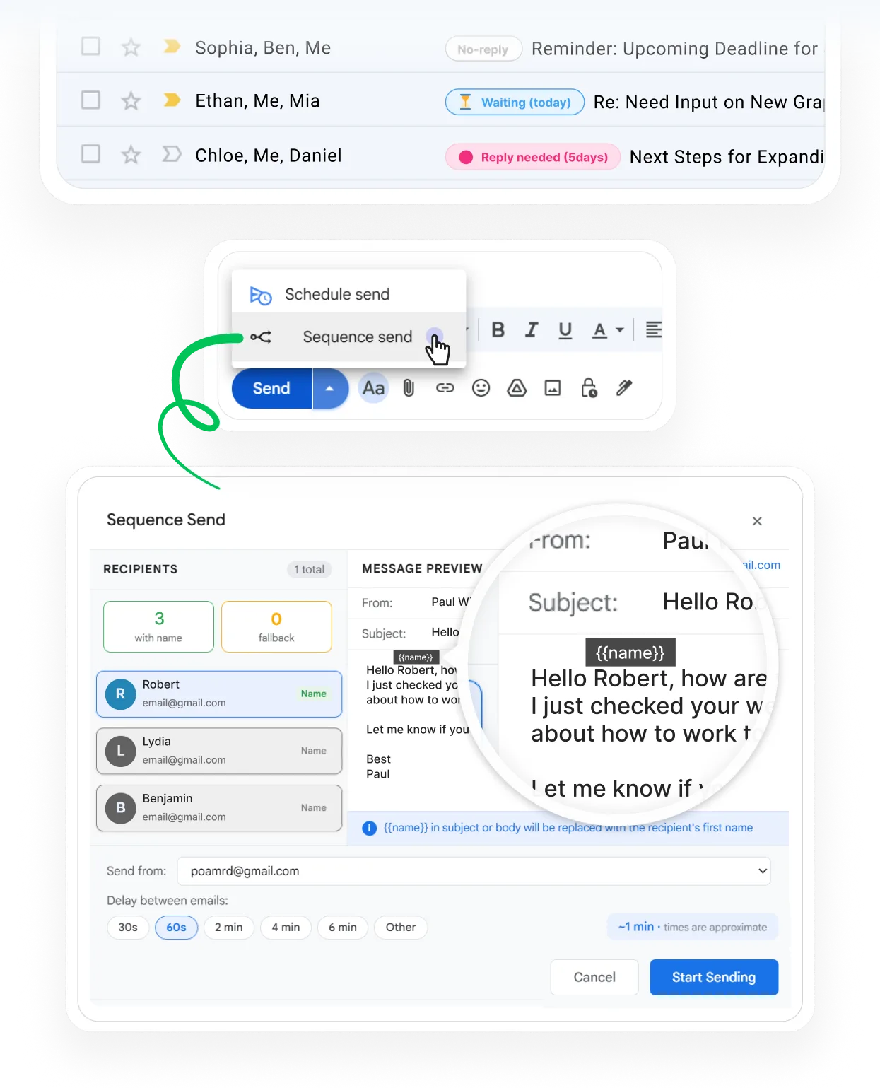 Send bulk emails with automatic personalization. Use {{name}}to insert each recipient's name automatically.